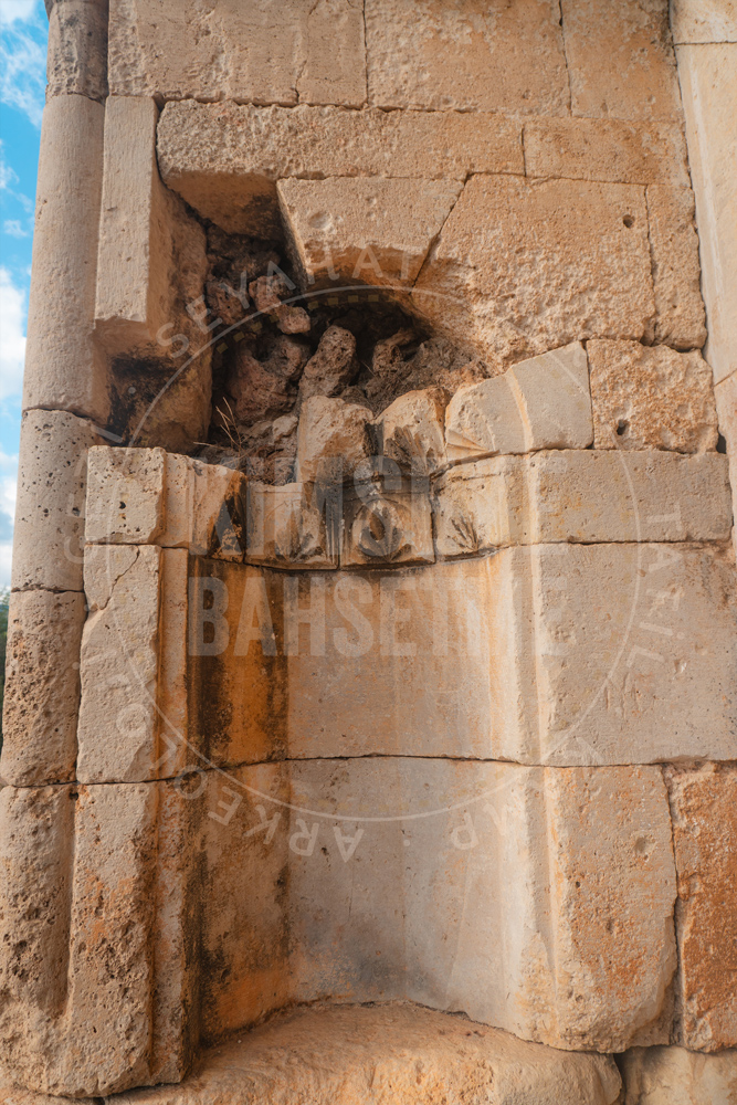 Bu süslemeler genellikle Selçuklu döneminde sıkça gördüğümüz geometrik formların olduğu Selçuklu mukarnas sanatının öncül formlarıdır. Bu tip dekoratif nişleri ve kapı girişlerini (taç kapı detaylarını) kendilerine has bir üslupla sıfırdan işlemişlerdir. Bu süsleme tarzı Roma döneminde yoktur. Roma mimarisi daha çok düz silmeler, yaprak motifleri (akantus) ve sütun başlıkları kullanır. Üstteki fotoğraftan anlayacağımız üzere fotoğraftaki kavisli niş yapısı kerv giriş portalının yan kanatlarına aittir. Bu form tamamen İslam mimarisi estetiğine göre şekillendirilmiştir.