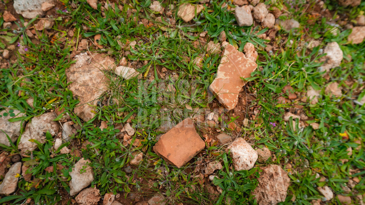 Bu sırada dolaşırken yerlerde bol bol pişmiş toprak-kiremit benzeri hafif turuncu parçalardan görüyoruz. Neredeyse tüm antik kentin tamamına yayılmış durumda gibi. Fotoğrafta görülen bu pişmiş toprak parçaları, arkeoloji terminolojisinde keramik buluntular olarak adlandırılır ve büyük bir olasılıkla antik döneme aittir. Lyrboton Kome gibi binlerce yıl boyunca yerleşim görmüş bir alanda, yüzeye yayılmış bu tür parçalarla karşılaşmak oldukça doğaldır. Görseldeki parçalar genellikle antik dönemde günlük yaşamın vazgeçilmezi olan seramik kaplara (amphora, pithos veya kiremitler) aittir. Renkleri ve dokuları, bölgedeki demir oksit oranı yüksek kırmızı topraktan imal edildiklerini ve yüksek ısıda fırınlandıklarını gösterir. Ayrıca kalın ve düz formdaki bazı parçalar, antik evlerin çatılarında kullanılan pişmiş toprak kiremitlere de ait olabilir. Arkeologlar için bu tür parçalar, yerleşimin hangi dönemlerde aktif olduğunu anlamaya yarayan birer “tarihleme aracı”dır. Seramiğin dokusu, kullanılan çamur tipi ve pişirme tekniği; parçanın Roma, Helenistik veya Bizans dönemine ait olup olmadığını belirlemeye yardımcı olur.
